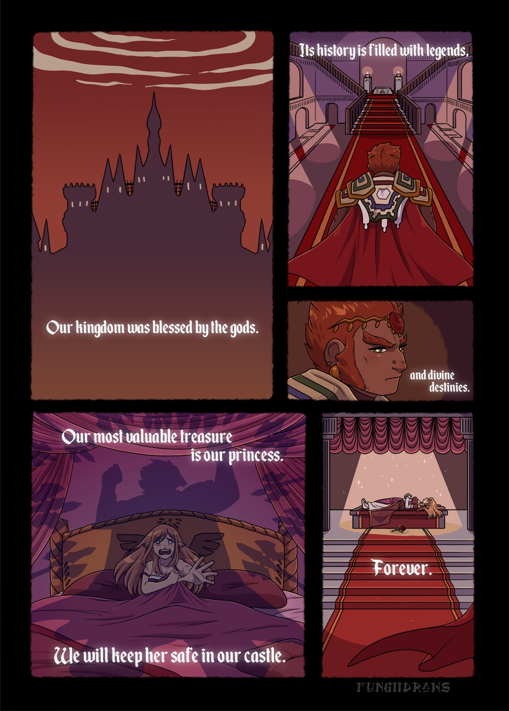 One of the things I love about the worldbuilding in the Legend of Zelda games is how gorgeously Gothic it is. Monsters and captive princesses and buried secrets, oh my! This comic isn’t just about castle spires and demon lovers and enchanted princesses, however; I also wanted to explore the troubled gender and racial politics of the Zelda series and make a statement about how the exclusionary prejudices that create monsters and damsels are hidden but ever-present in the legends that make heroes.