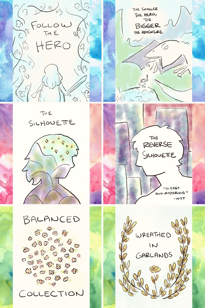 Since book covers serve the same purpose, I decided to launch this project by thinking about how certain compositions are used to convey specific moods, and I’ve been drawing quick studies along the way. Silja Götz’s online class Book Cover Illustration has been an incredible resource!