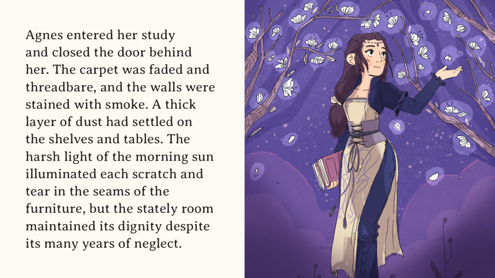 Agnes proceeds to her study, a dilapidated yet still handsome room where she secludes herself to work. She is interrupted by her cousin Galien, who encourages her to open the summer court. Agnes agrees, believing that a large and lively celebration will be an appropriate symbolic marker of her vow to rejuvenate the kingdom.