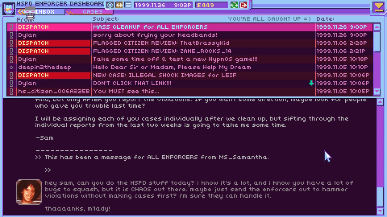 This lack of agency can be upsetting, especially when the game forces you to slap violation penalties on a teenage girl experiencing sexual harassment through DMs. She sent a support request to Hypnospace asking them to address the harassment, and she’s posted screenshots of the chats on her page. When you report these images as harassment, the girl is the one who’s penalized, as the images are hosted on her page.