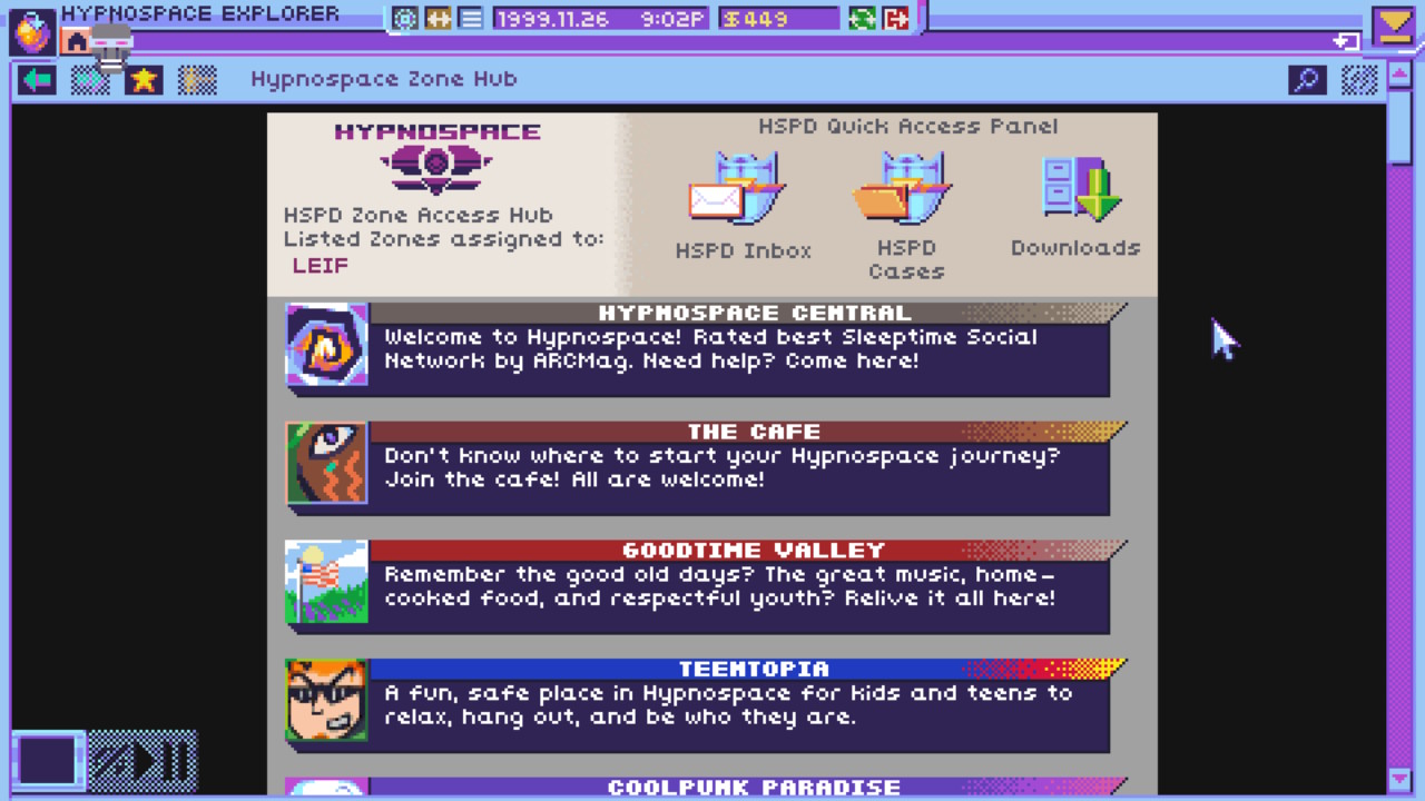 If you can tolerate the bad-on-purpose writing, however, all sorts of intriguing worldbuilding details begin to emerge. You never learn much, however, only bits and pieces of trivia that are incorporated into people’s discussions of their special interests. The main “alternate” aspect of this universe, which is that people access the internet by wearing a headband while they sleep, is never explained. It’s also not particularly important… until it is. Still, I wouldn’t say that Hypnospace Outlaw has anything as structured as a plot. You’re mainly just here for the vibes.