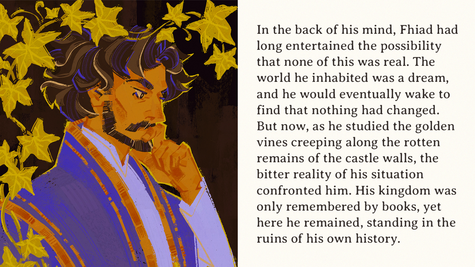 Fhiad reflects on the uncanny emptiness of Erdbhein Castle as he leads Agnes to the queen’s ruined chambers. While describing Erdbhein before the war, Fhiad tells Agnes about his three sisters, all of whom were highly competent administrators. Fhiad confesses that he dreamed of becoming a mage so he could return to Erdbhein to build monumental stone structures aboveground to rival the stonework in the long-abandoned city underneath the castle.