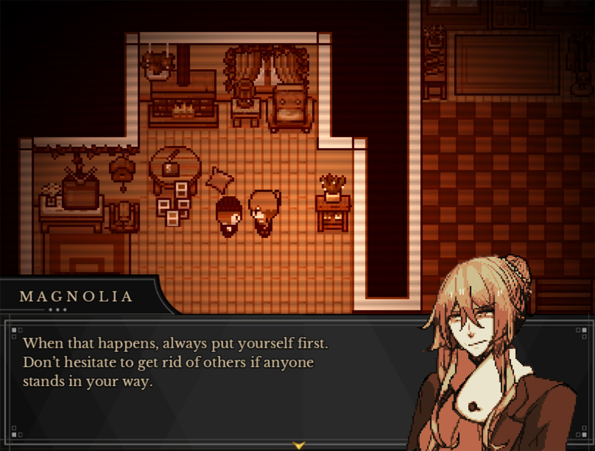 What sets Symbiosis apart from the crowd of RPG Maker horror games is the creator’s gleeful willingness to allow Magnolia to be messy and problematic. She initially seems to be a complete sociopath, and her bad behavior is a joy to watch. As you witness her interactions with Mint unfold, however, her character becomes more complicated. Why Magnolia feels affection for Mint is open to interpretation, but I think it’s fair to say that her attachment is genuine.