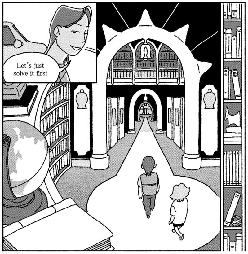 The Corus Wave is a celebration of the joys of research. The hunt for Corus’ manuscripts begins with a footnote that becomes a rabbit hole, but the story evolves in a more practical direction as the two students find friendship and support in a scholarly community. Their fieldwork provides opportunities to appreciate the human stories behind a built environment whose unique design flourishes might otherwise be taken for granted. The Corus Wave is about going offline and touching grass, the pleasure of which is conveyed through gentle and attractive art that presents lively and expressive characters navigating interior spaces that only reveal their secrets under close observation.