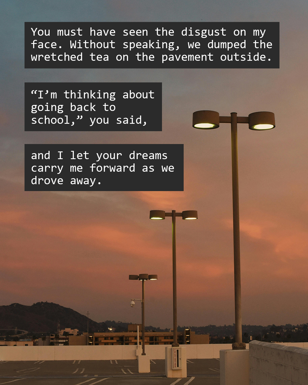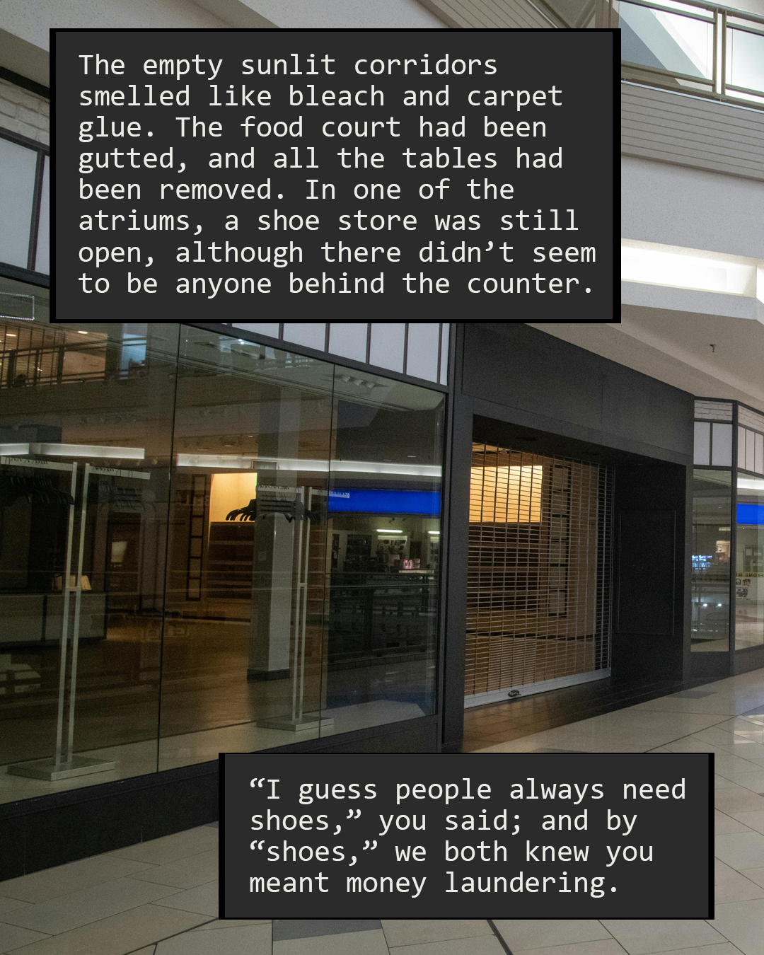 The theme of this contest was “liminality,” and what better setting than a dead mall? Nostalgia is creepy, and the horror of dead malls is the uncanniness of feeling your history collapse into a marketing demographic that no longer fits.