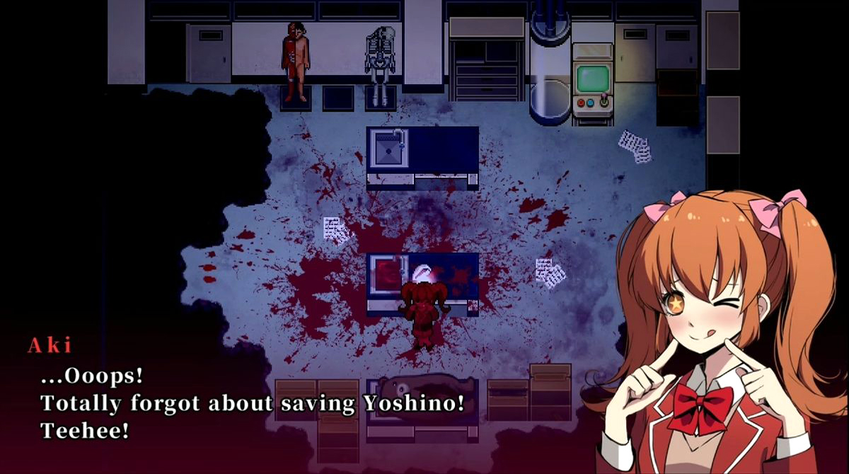What I love about Misao is how much fun this game has with the tropes and imagery of a haunted high school. The laboratory is staffed by a mad scientist who has a chainsaw and will take advantage of any excuse to use it. The hamburgers in the cafeteria are made of unspeakable meat, and the seating area in front of the open kitchen is filthy with blood and entrails. The toilets haven’t been cleaned for a very long time, nor has the secret zombie cave under the school. The Shinto shrine in the courtyard is beautiful, but the rituals performed there are anything but.