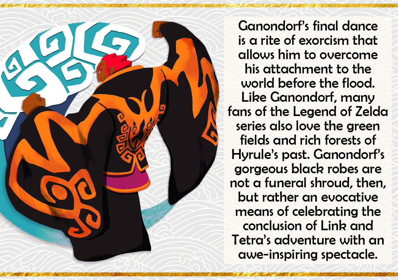 “A Wind-Grieved Ghost” discusses the influence of medieval Noh theater on the striking costume worn by Ganondorf in The Wind Waker. I provide a brief introduction of Noh drama and summarize how its character archetypes are enhanced by their clothing. I then explain the symbolism of Ganondorf’s gorgeously patterned robes and argue that the sartorial allusions to Noh theater serve to characterize Ganondorf as a frightening yet tragic ghost displaced from the beautiful vanished kingdom of Hyrule.