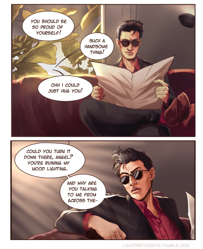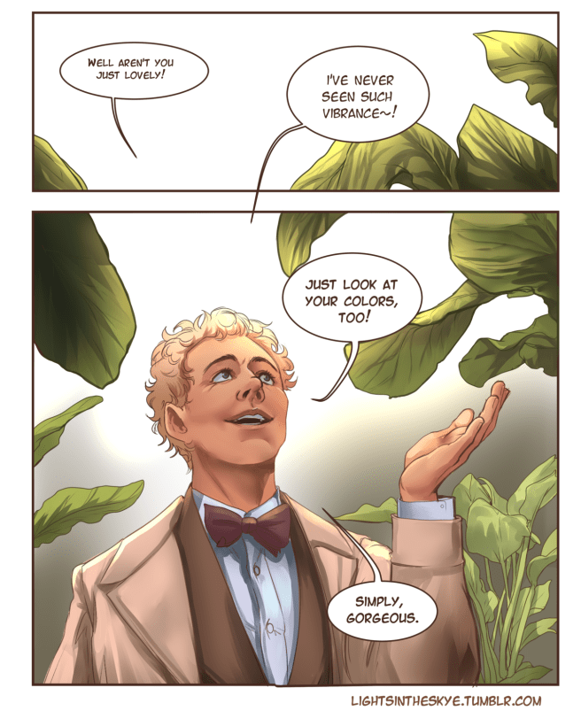 I say this comic was written by me, but what really happened was that I sent Naomi a rambling email about how much I was enjoying the Good Omens miniseries on Amazon. I’ve been a fan of the book since I was in high school, and I think Naomi owns literally a dozen copies of it. Every character in Good Omens is wonderful, but I have a special fondness for the serpent who, having fallen from grace, makes a garden of his own.