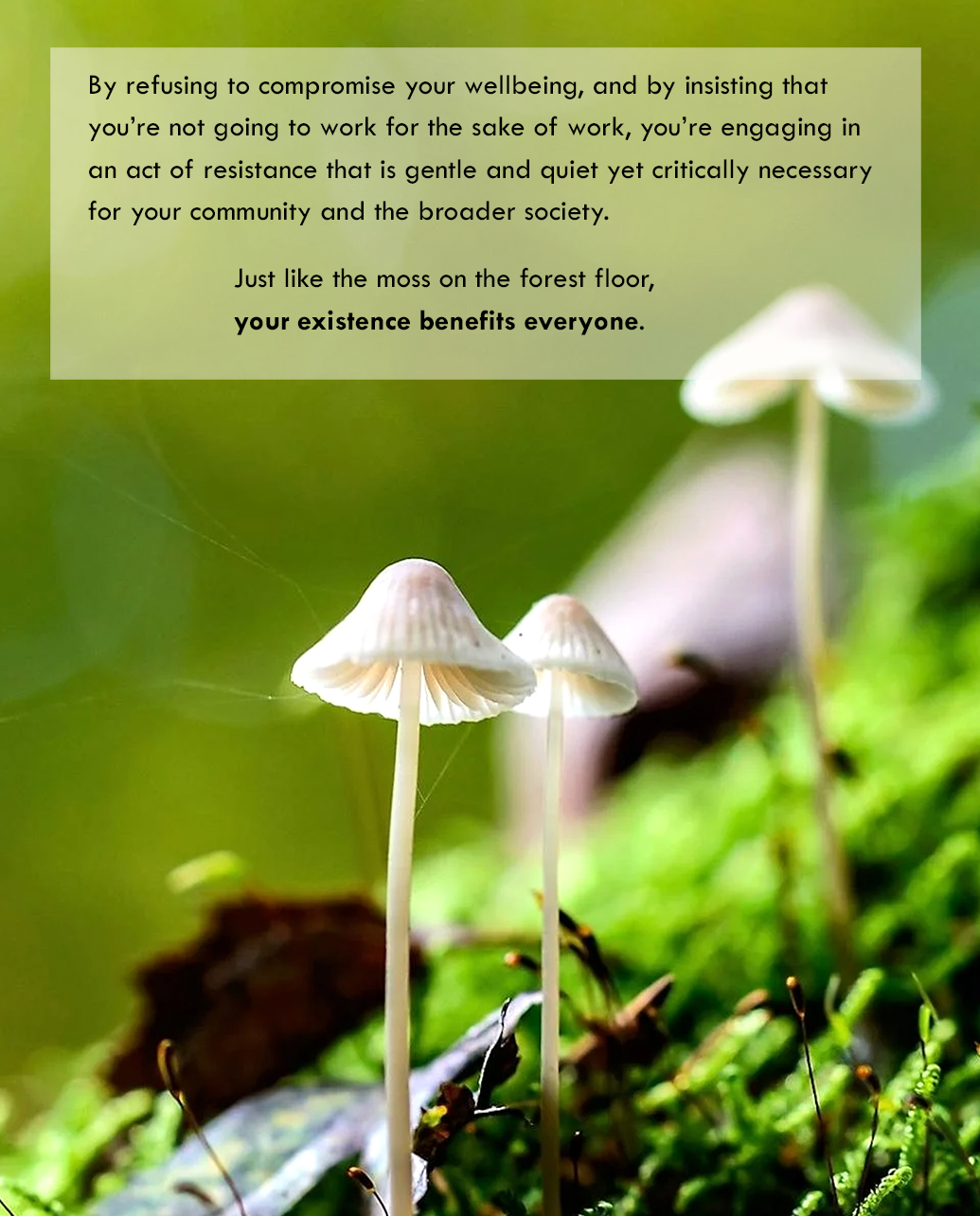 When I write about “resisting productivity,” I’m speaking from the position of someone in academia who is directly affected by the myth that hard work will lead to prosperity. I hate the way this myth is weaponized against disabled people in the realm of higher education, and I want to destroy it. Very softly and quietly. Like moss.