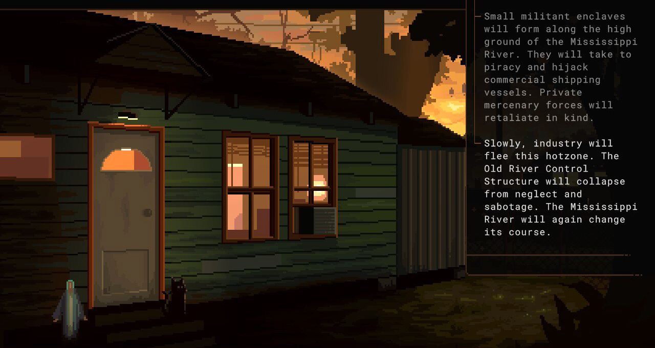 In Night in the Woods, you play as Mae, an anthropomorphic cat who has dropped out of college and moved back to Possum Springs to live with her parents. With no job and nothing better to do, Mae decides to investigate the disappearance of several local children. It turns out that there is a monster living in the abandoned mine tunnels under Possum Springs, and a cult of town residents has been feeding young people to this creature in return for a promise that it will prevent the town’s economic decline. When Mae and her friends catch the cult in the act of sacrificing one of its own members, its leader tells the group of teenagers that these rituals aren’t easy for them, especially now that they’re getting older. It’s time for a new generation to take over and ensure the prosperity of Possum Springs, however modest this prosperity might be.