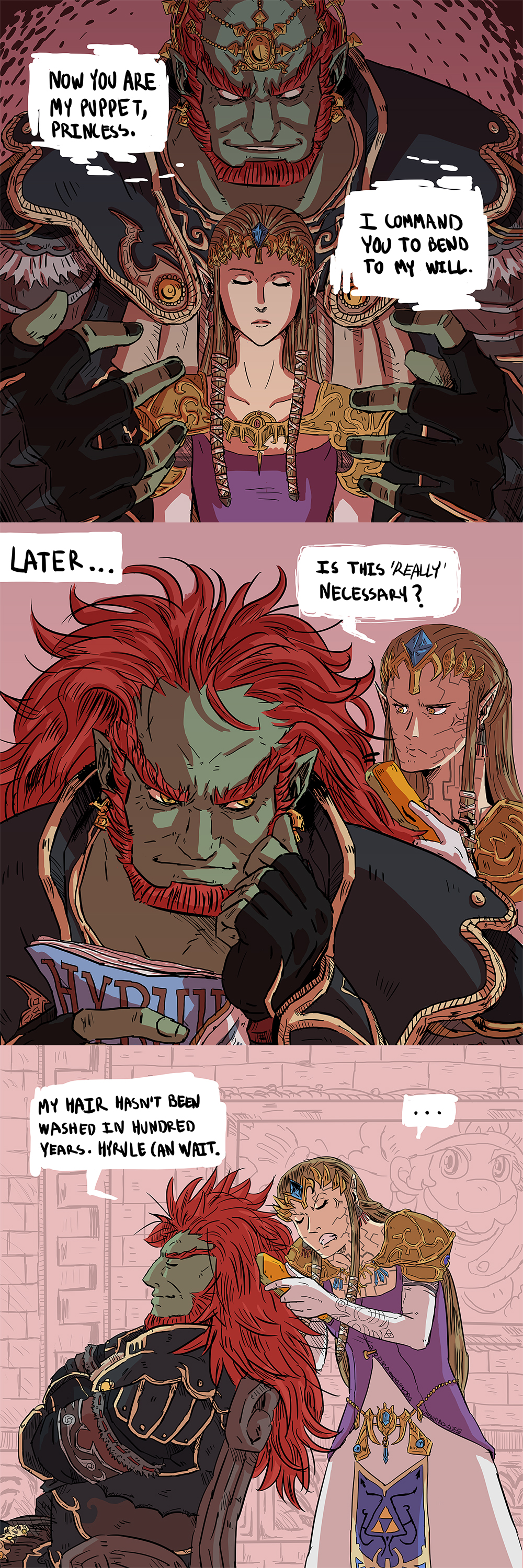For me, there have always been two major mysteries at the heart of Twilight Princess. First, why does Ganondorf feel the need to possess Princess Zelda at the end of the game? Second, how does he manage to put his hair up in such an elaborate style? When these two questions are viewed side by side, the answer to both becomes obvious.